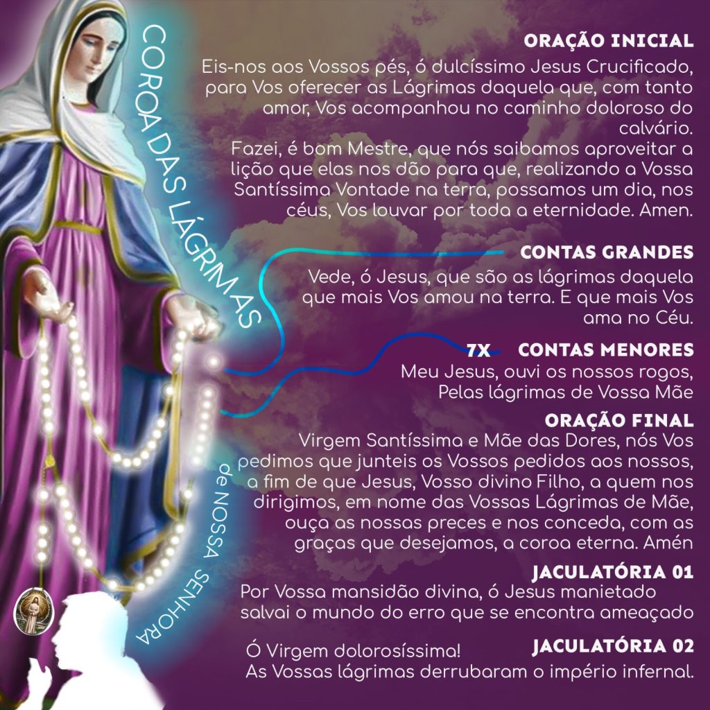 Transcrevo a seguir as orações e o modo de rezar a Coroa das Lágrimas de Nossa Senhora conforme descrito no livro da historiadora Rita Elisa Seda, “Irmã Amália e a devoção a Nossa Senhora das Lágrimas”, edição publicada em 2022 pela Editora Imaculada (pag 172/173).